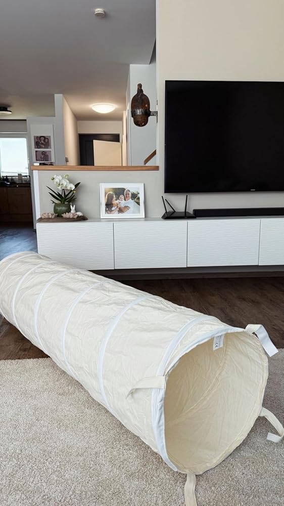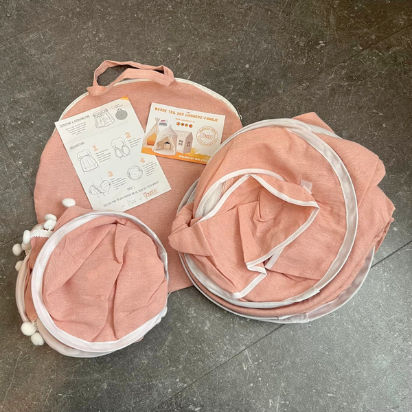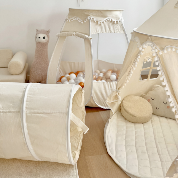 Unser rundes Spielzelt, der passende Spieltunnel und das Bällebad-Zelt sind aus dem gleichen hochwertigen Baumwolle-Hanf-Gewebe gefertigt und in identischen, ruhigen Farbtönen erhältlich. So entsteht eine stimmige, natürliche Spielumgebung, die sich harmonisch ins Kinderzimmer einfügt.