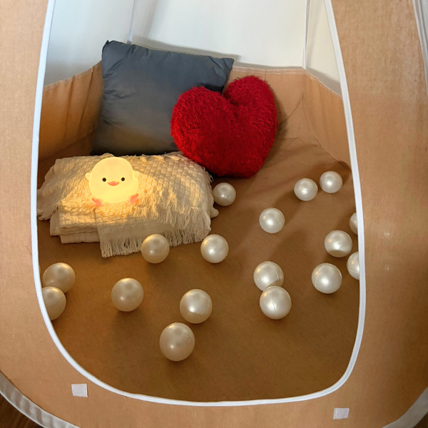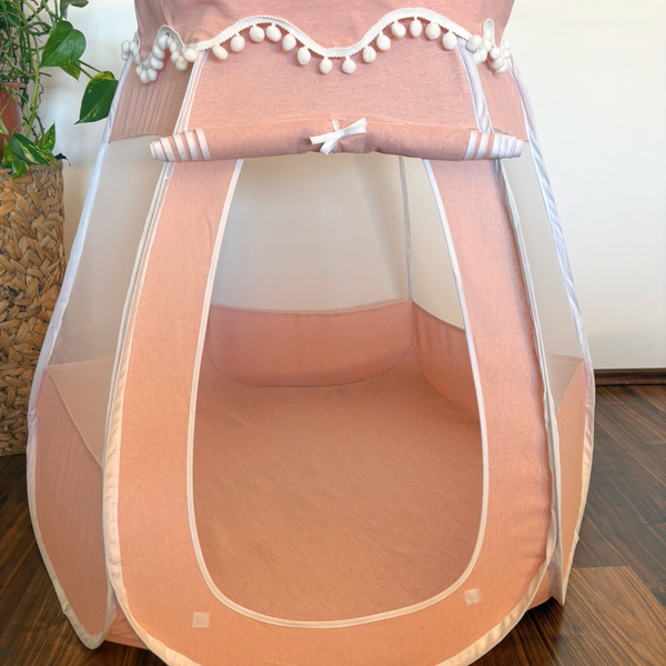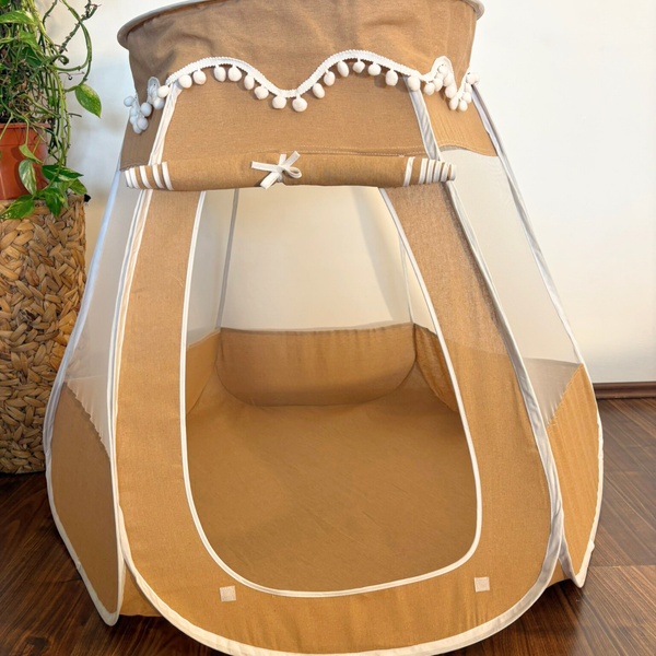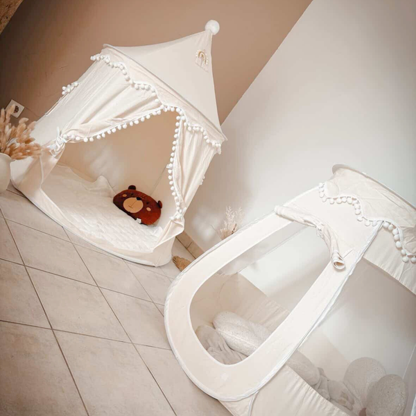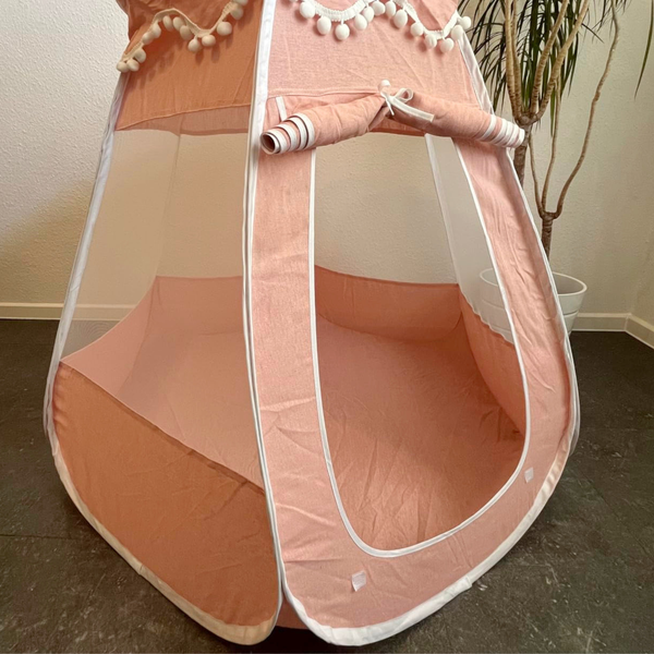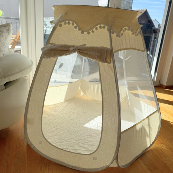 Die luftigen Mesh-Fenster, die verschließbare Tür und die weiche Form machen es zu einem sicheren Rückzugsort – ideal zum Spielen, Entspannen und Träumen.