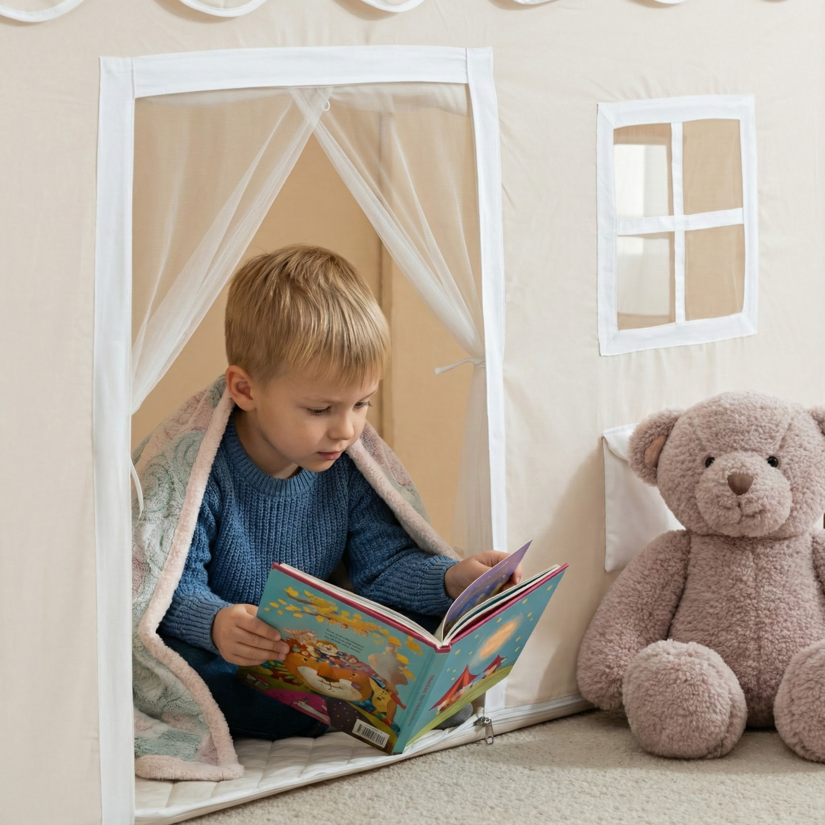 Die Tür verfügt zusätzlich über einen blickdichten Vorhang – für mehr Geborgenheit und ungestörte Spielmomente.