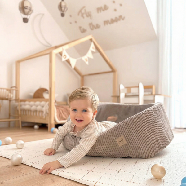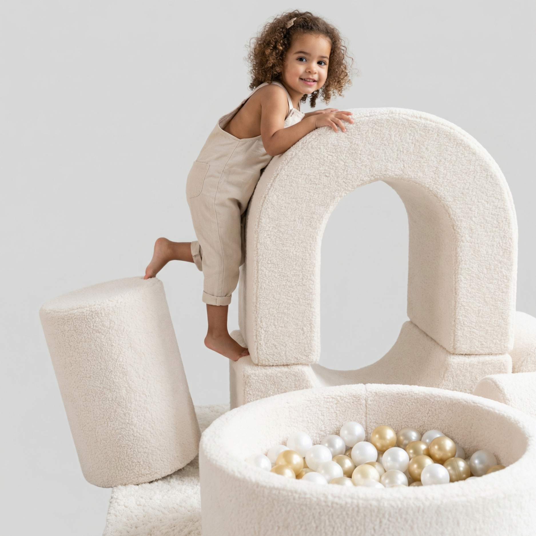 Das "Woolly Castle" ist mehr als ein Spielplatz – es ist ein ganzer Fantasiebereich für kleine Entdecker. Gefertigt aus flauschigem Stoff in Lammfell-Optik, vereint es Geborgenheit, Spielspaß und Entwicklung in einem. Jedes der neun Elemente lädt Kinder zum Klettern, Bauen, Rollen oder Kuscheln ein und regt ihre Fantasie an.