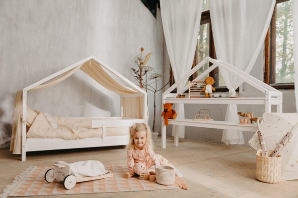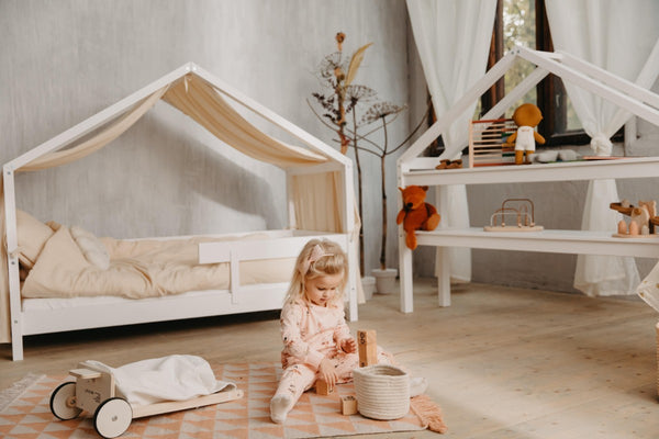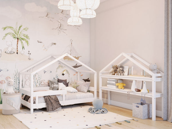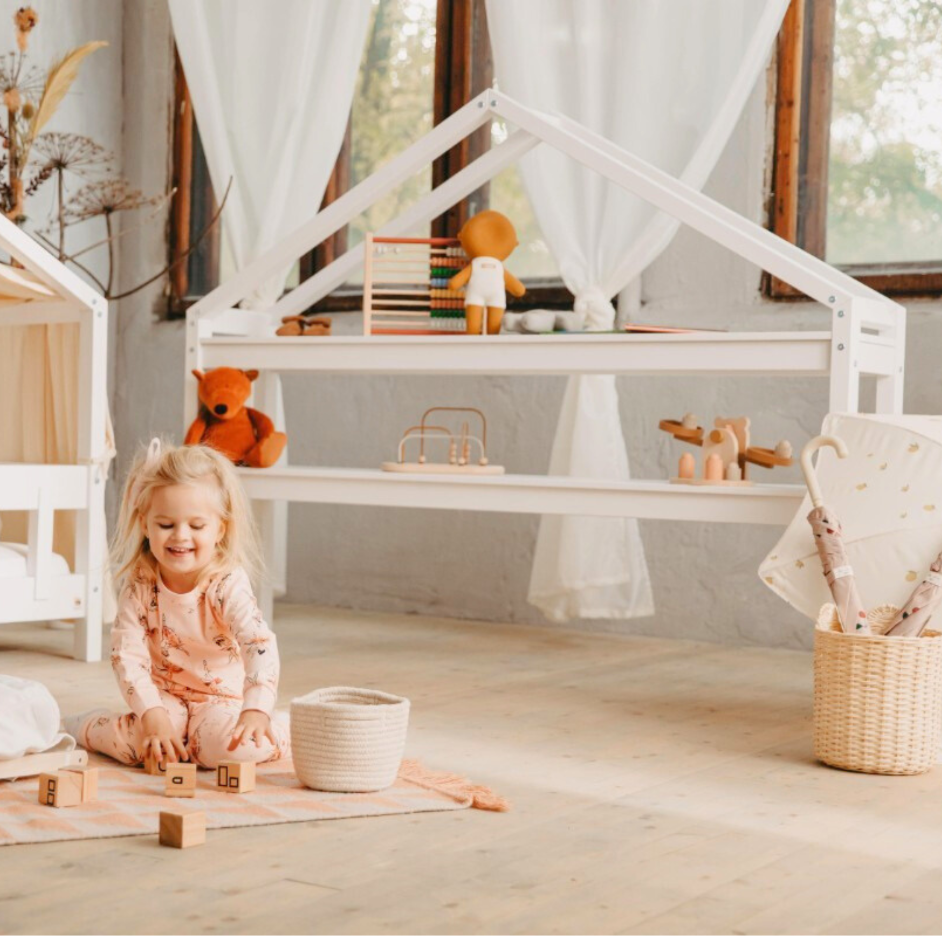 Stabiles Regal in Hausform – für Ordnung und skandinavisches Flair im Kinderzimmer.