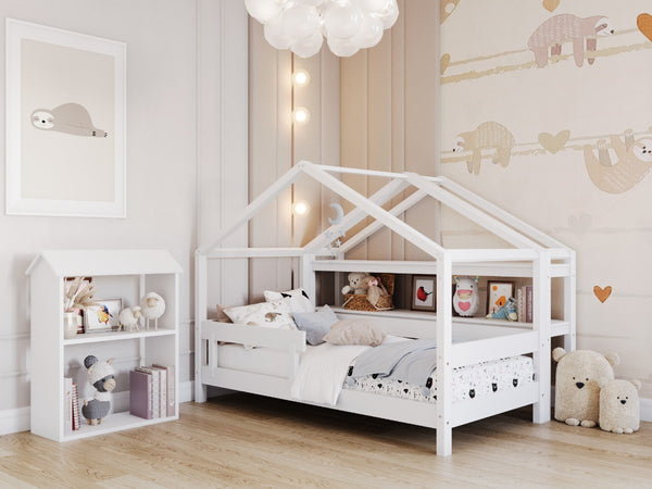 Das liebevoll gestaltete Regal in Hausform schafft nicht nur Ordnung, sondern auch eine warme, einladende Atmosphäre im Kinderzimmer. Ideal zum Aufbewahren von Büchern, Spielzeug und Dekoration – und perfekt abgestimmt auf das Yappy JUNIOR Hausbett.