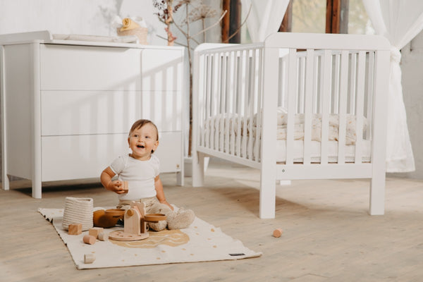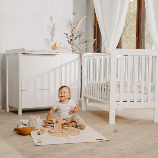 Mit seinen 3 großen Schubladen bietet sie viel Stauraum für Kleidung, Windeln und Babyutensilien. Der abnehmbare Wickelaufsatz (75 × 55 cm) lässt sich flexibel links oder rechts montieren und verwandelt die Kommode später in ein langlebiges Möbelstück, das dich weit über die Wickelzeit hinaus begleitet.